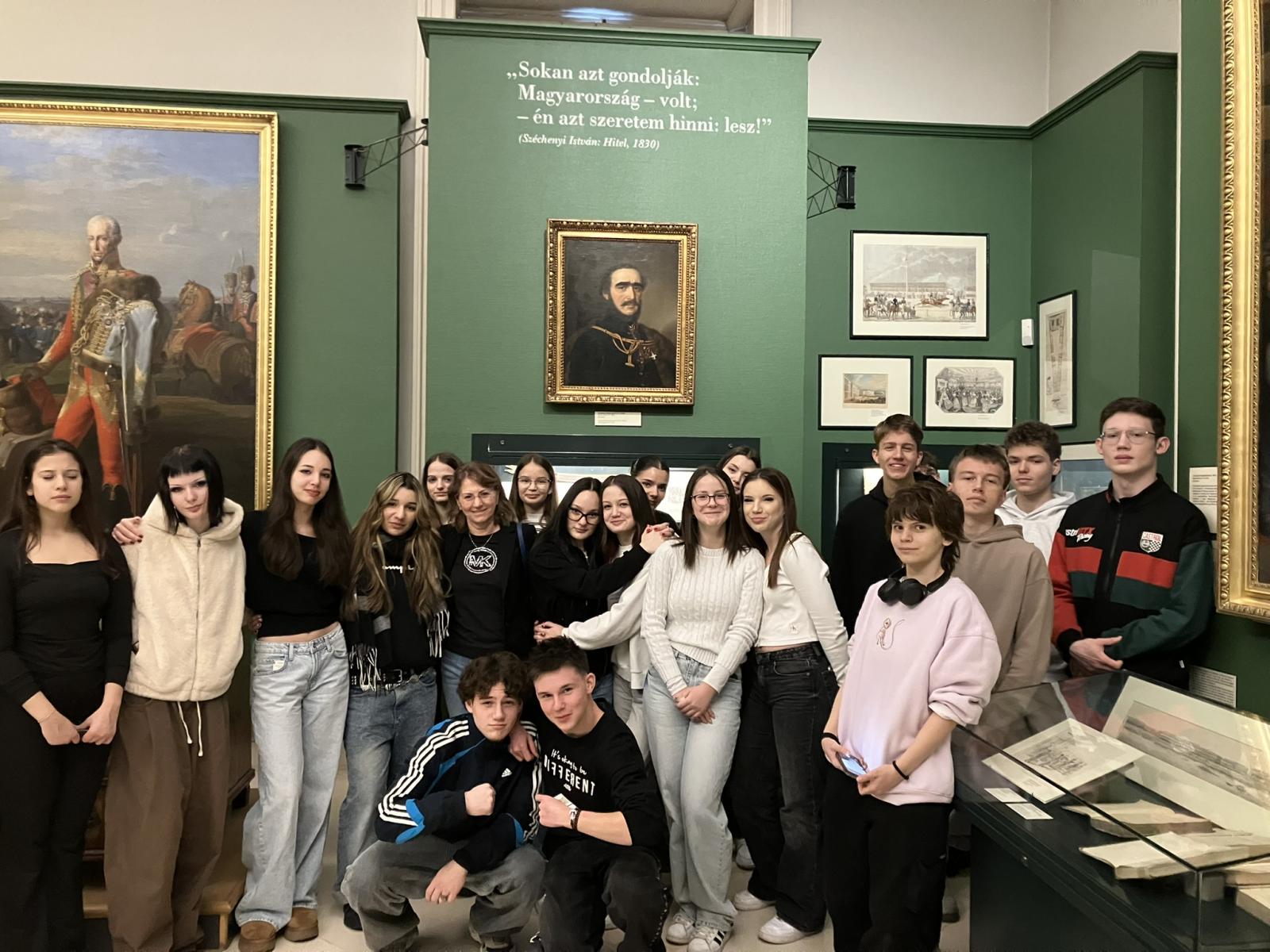 Első állomásunk a Magyar Nemzeti Múzeum volt, amely Magyarország történetét mutatja be a kezdetektől napjainkig. A múzeum termeiben több ezer műtárgy és kiállítás várja a látogatókat, beleértve történelmi relikviákat és régészeti leleteket is. Már az épület impozáns homlokzata is lenyűgöző volt, amely a város egyik kulturális jelképe. Megnéztünk több kiállítást, amelyek az őskortól a modern korig vezették végig a magyar történelmet. A tanáraink segítségével még többet tanultunk a kiállított tárgyakról és azok jelentőségéről. Képek, festmények, pénzérmék, egyházi és vallásos ereklyék díszítették a kiállítást, amik mind megragadták a figyelmemet. Engem nagyon lekötött és örültem, hogy eljuthattam ide. Személy szerint a két kedvenc részem a második világháborús rész volt, ahol a kommunizmusról olvastam, régi újságokból, könyvekből és a Nórival csináltunk egy szelfit az élethű és ember méretű Sztálin szoborral is. A másik kedvenc részem a régi viszont gyönyörű és szépen fenntartott női ruhák voltak. Elcsodálkoztam rajtuk és egyszerre fel is próbáltam volna az összeset. Csináltunk osztályképet egy festmény elött, ami Gróf Széchenyi Istvánt ábrázolta ez is tetszett hiszen az iskolánk az ő nevét viseli. A felújítások miatt