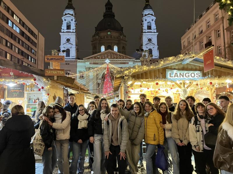 Miután kijöttünk, a nap már kezdett hűvösre fordulni, de a hangulat remek volt. Következő úti célunk a budapesti karácsonyi vásár volt, amely már adventi fényekkel és illatokkal fogadott minket. A vásár a Vörösmarty téren és a Szent István téri Advent Bazilika előtt volt megtalálható. Gyönyörű fények, díszek és kézműves standok várták a minket. A bazilika homlokzatán megjelenő fényjáték különleges élményt nyújtott este. A vásári forgatag és a karácsonyi zene ünnepi hangulatot teremtett. Ez a kirándulás nemcsak szórakoztató, de tanulságos is volt számunkra. Megismerhettük a saját országunk történelmét, az európai politikát és a karácsonyi hagyományokat egyaránt. A nap végén mindannyian fáradtan, de boldogan értünk haza. Ez a decemberi kirándulás örök emlék marad számunkra. Összegezve, nagyon élveztem a napot és a programokat. Köszönjük szépen (az osztály nevében is) tanárnő, hogy elvitt minket és ilyen élményre tehettünk szert hiszen, ha realisztikusan gondolkodunk szerintem egyikünk se jutott vagy ment volna el ilyen helyekre az osztályból. Remélem még sok ilyen jó hangulatú és élménydús kirándulást élünk át együtt az osztállyal.