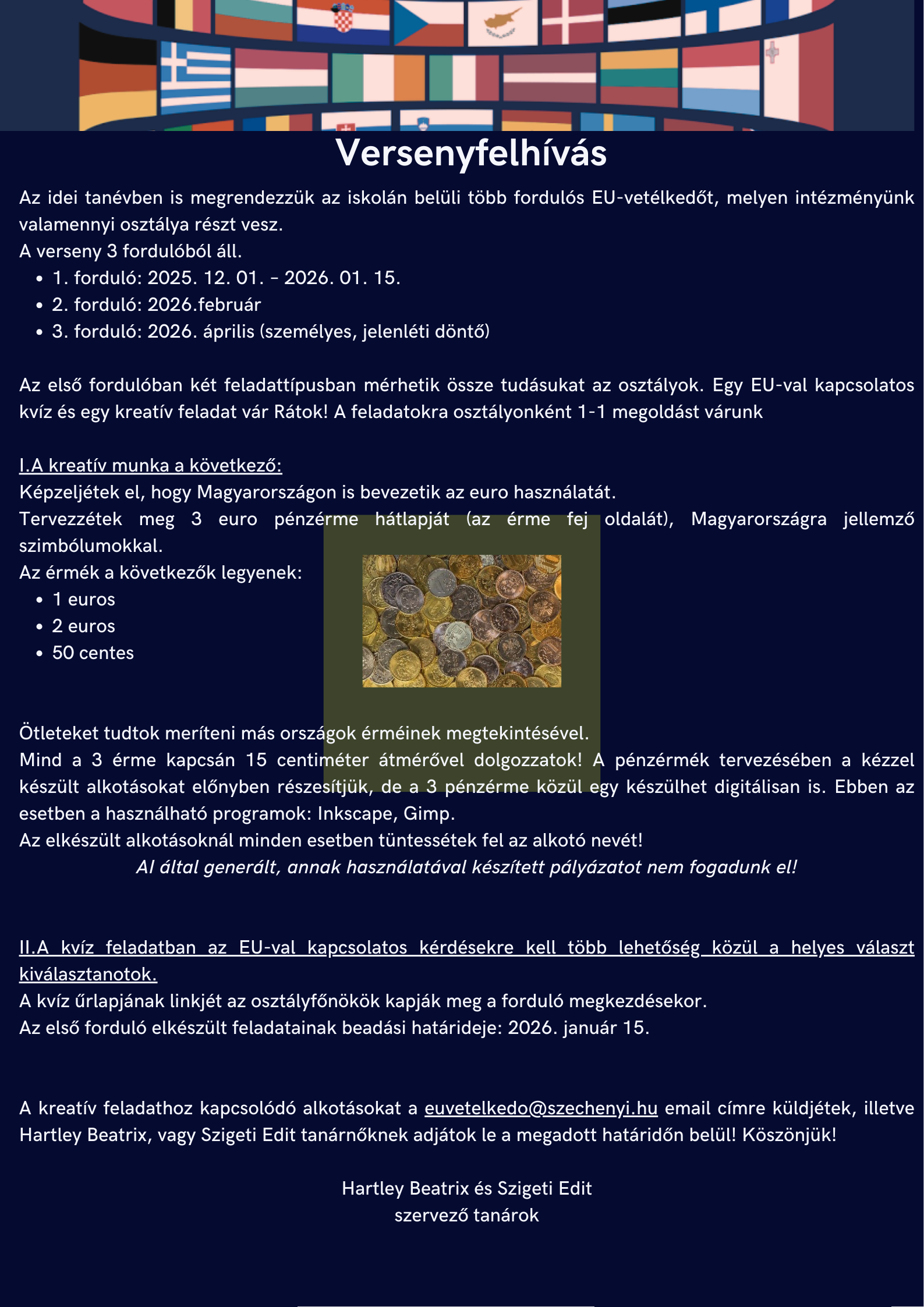 A kreatív feladathoz kapcsolódó alkotásokat a euvetelkedo@szechenyi.hu email címre küldjétek, illetve Hartley Beatrix, vagy Szigeti Edit tanárnőknek adjátok le a megadott határidőn belül! Köszönjük.