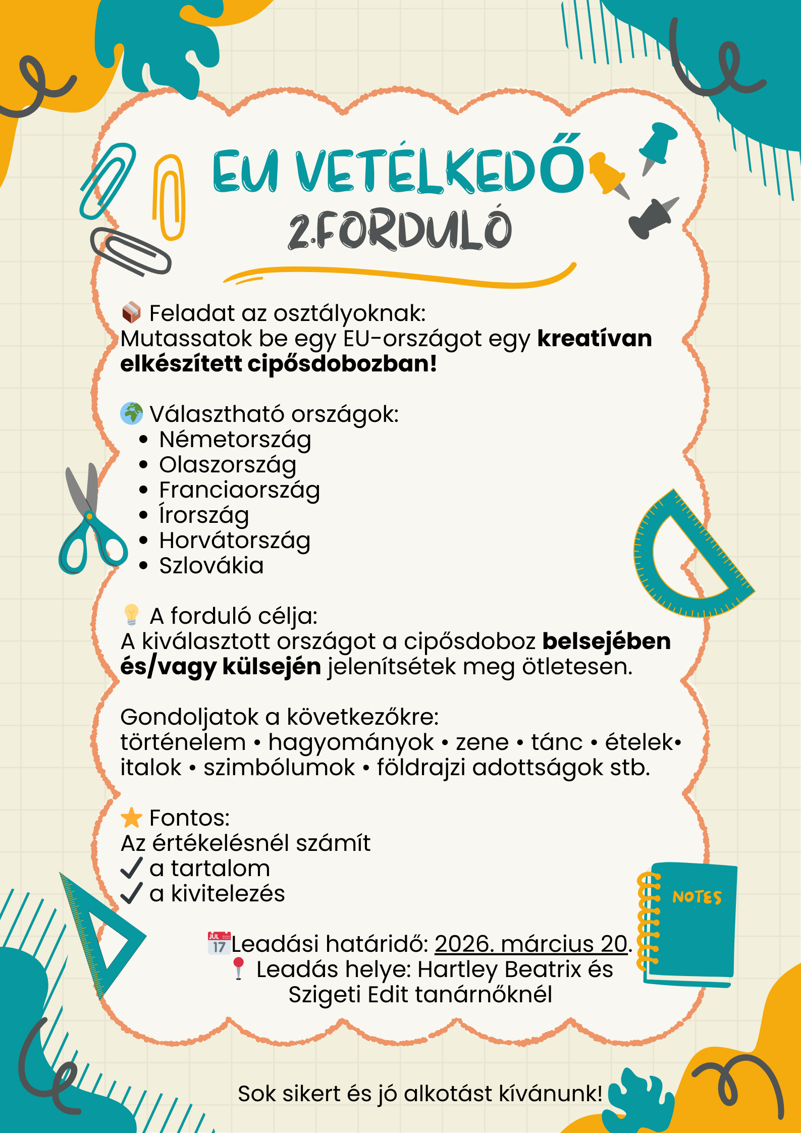 Az EU vetélkedő 2. fordulójában minden osztálynak egy feladata lesz. Mutassatok be egy EU országot. Választható országok: Németország, Olaszország, Franciaország, Írország, Horvátország, és Szlovákia.