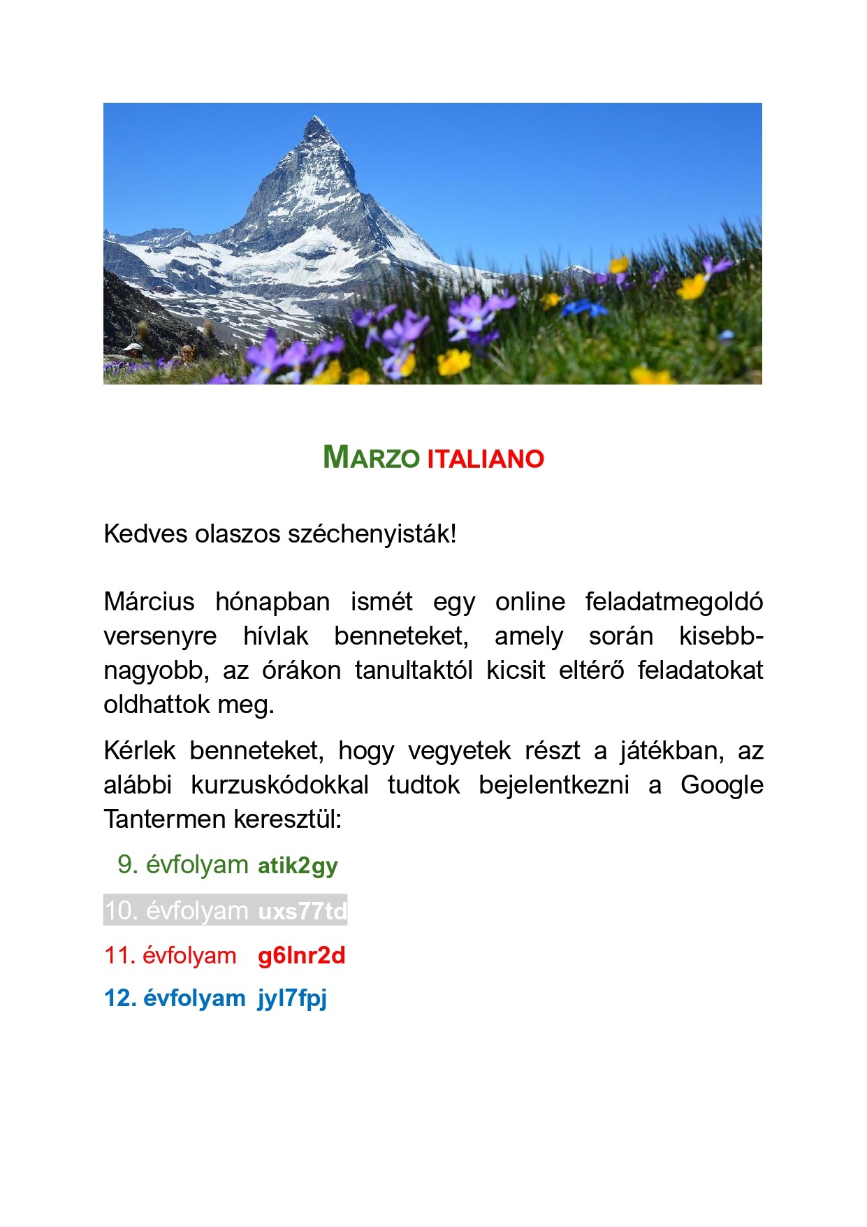 Kérlek benneteket, hogy vegyetek részt a játékban, az alábbi kurzuskódokkal tudtok bejelentkezni a Google Tantermen keresztül: